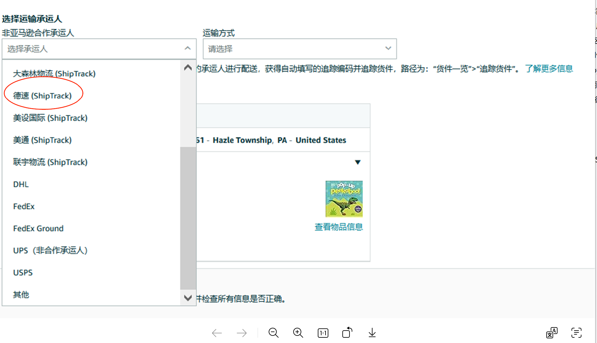 賣家在亞馬遜賣家平臺創(chuàng)建貨件時,選擇框中會出現(xiàn)可以選擇ShipTrack承運(yùn)商的提示。ShipTrack承運(yùn)商會顯示在“選擇運(yùn)輸承運(yùn)人”的下拉列表里,選擇德速(ShipTrack)”作為承運(yùn)商。